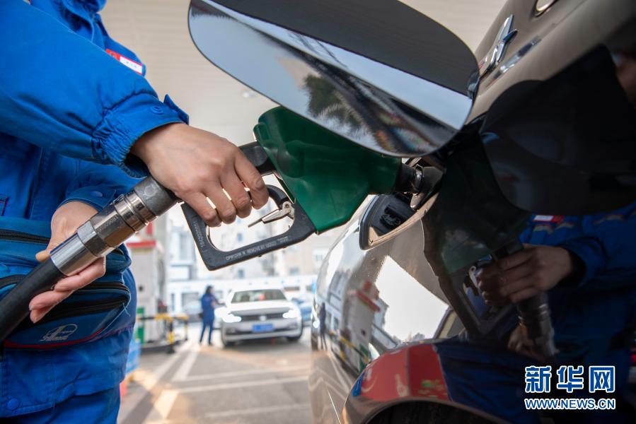 1月15日,江苏南通海安市一加油站的工作人员在给车辆加油。
