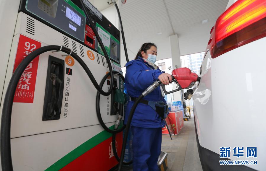 1月15日,江苏省连云港市一加油站的工作人员在给车辆加油。