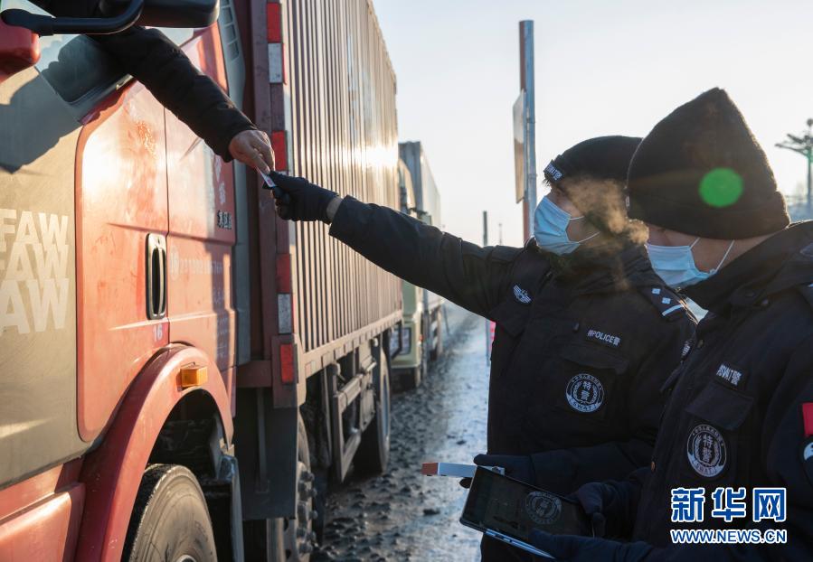 1月16日,执勤特警在绥化市城南高速口入城处对司机进行信息核查。