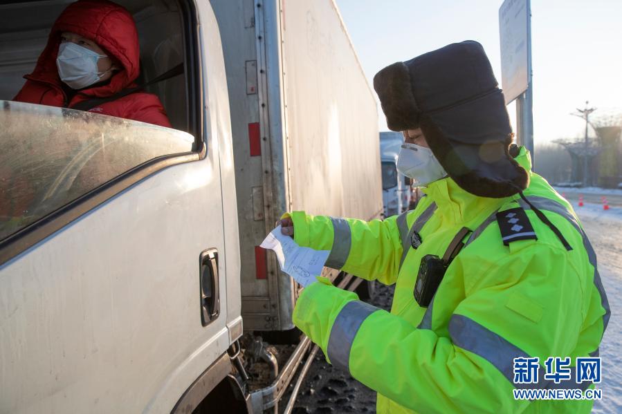1月16日,执勤交警在绥化市城南高速口入城处对司机进行信息核查。新华社发(张涛摄)