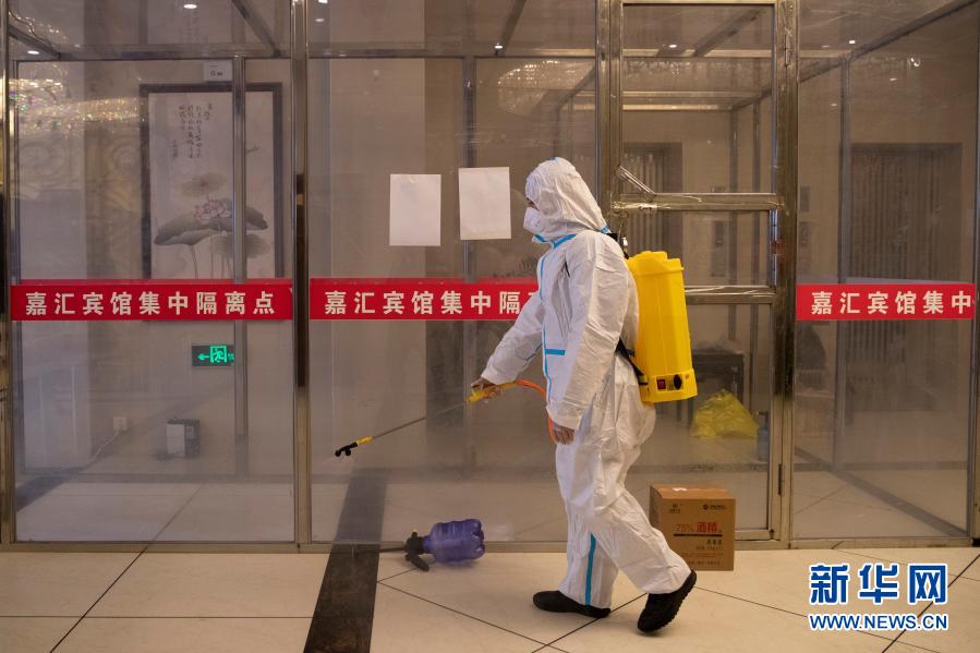 1月15日,隔离点医护人员在望奎县嘉汇酒店集中隔离点进行消杀作业。新华社发(张涛摄)