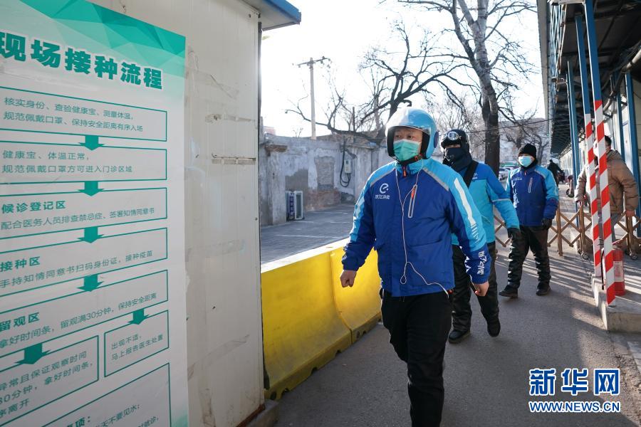今年35岁的张卫鹏是在北京市工作的一名外卖骑手,当天一早他从北京市北四环的住处出发,来到位于北京市东城区天坛街道祈谷社区的新冠疫苗临时接种点接种新冠疫苗,和他一起接种的还有几十名同样准备留在北京过春节的骑手同事。