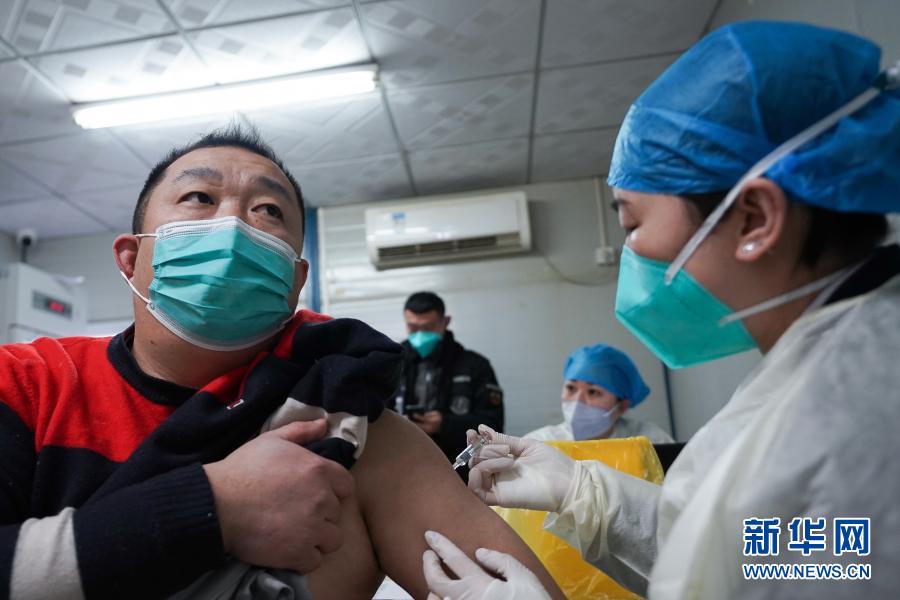 1月17日,在北京东城区天坛街道祈谷社区的新冠疫苗临时接种点,医护人员为外卖骑手张卫鹏接种新冠疫苗。