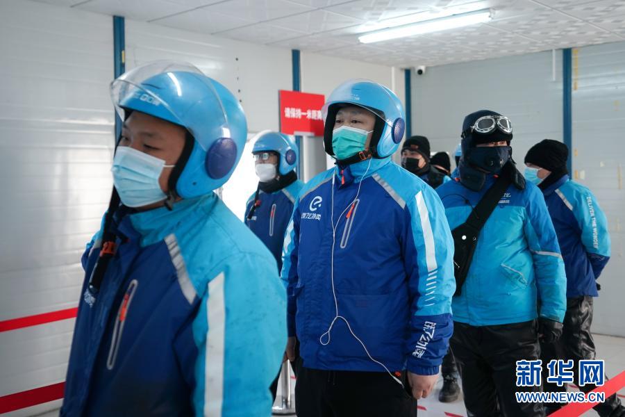 1月17日,外卖骑手张卫鹏(前左二)与同事在新冠疫苗临时接种点内排队等候。