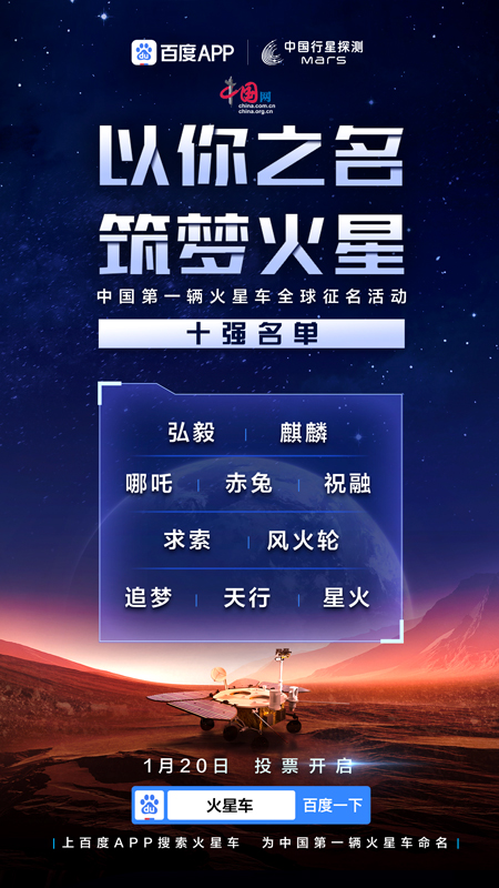 2021年1月18日,国家航天局探月与航天工程中心表示,我国首辆火星车全球征名活动已经完成初次评审。经评审委员会初步评审,投票遴选出弘毅、麒麟、哪吒、赤兔、祝融、求索、风火轮、追梦、天行、星火共10个名称,为我国首辆火星车的命名范围。1月20日12时起,将进行为期40天的全民网络投票。