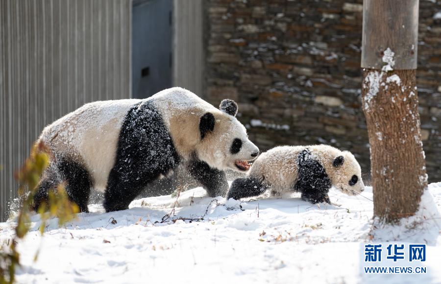 近日,中国大熊猫保护研究中心卧龙神树坪基地频繁降雪,生活在这里的“芊芊”带着自己的一对双胞胎幼仔每天快乐地在雪地里扑玩、追跑、攀爬树桩等,在嬉戏中训练幼仔生存技能。