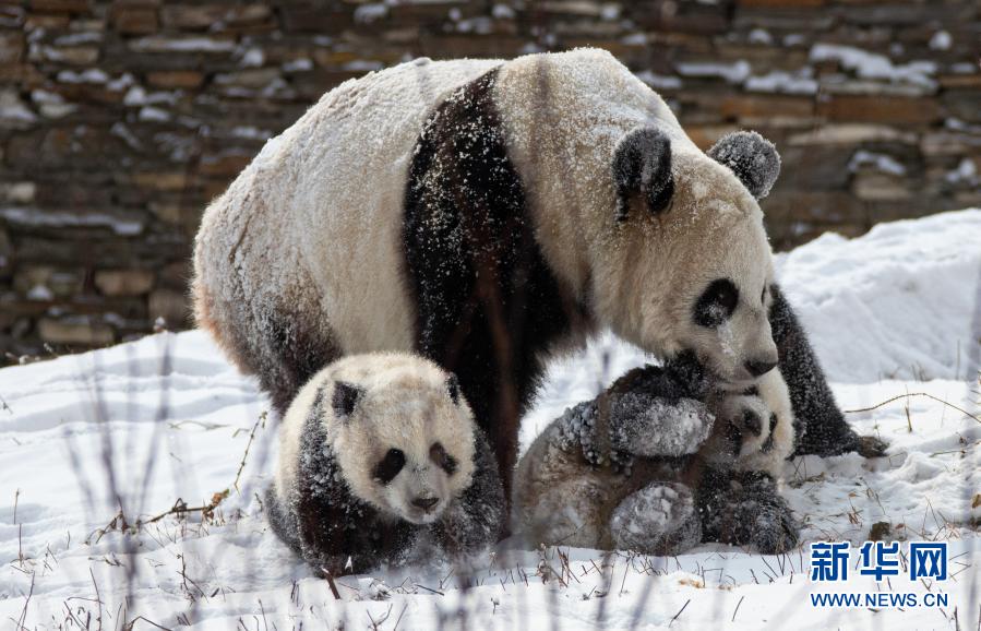 近日,中国大熊猫保护研究中心卧龙神树坪基地频繁降雪,生活在这里的“芊芊”带着自己的一对双胞胎幼仔每天快乐地在雪地里扑玩、追跑、攀爬树桩等,在嬉戏中训练幼仔生存技能。