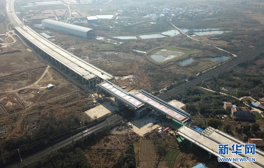 1月19日,107国道跨京广铁路转体桥成功完成转体(无人机照片)。