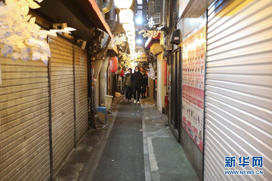 1月22日,在日本东京新宿的一条街上,人们走过关闭的店铺。