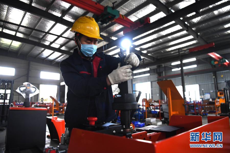 安徽省肥西县花岗镇的一家智能叉车生产企业工人在生产线上工作(2020年4月6日摄)。