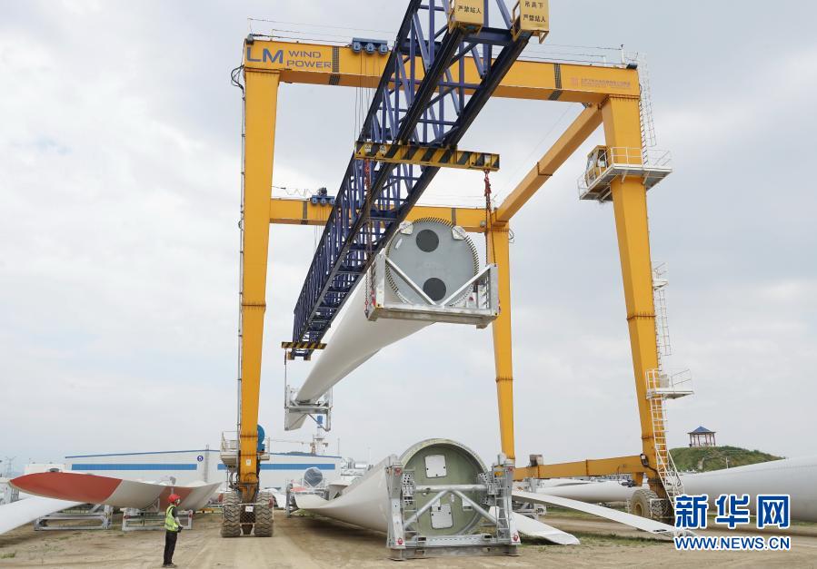 河北秦皇岛经济技术开发区一家风电设备生产企业的工人在操作吊装设备吊运风力发电机叶片(2020年8月1日摄)。