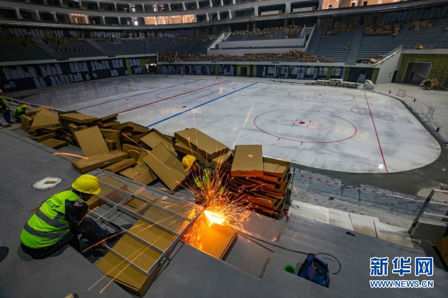1月27日,工人在成都凤凰山体育公园综合体育馆内安装护栏。这里将承办成都大运会的篮球比赛。新华社记者 沈伯韩 摄