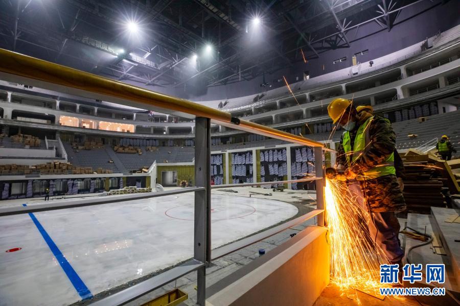1月27日,工人在成都凤凰山体育公园综合体育馆内安装护栏。这里将承办成都大运会的篮球比赛。新华社记者 沈伯韩 摄