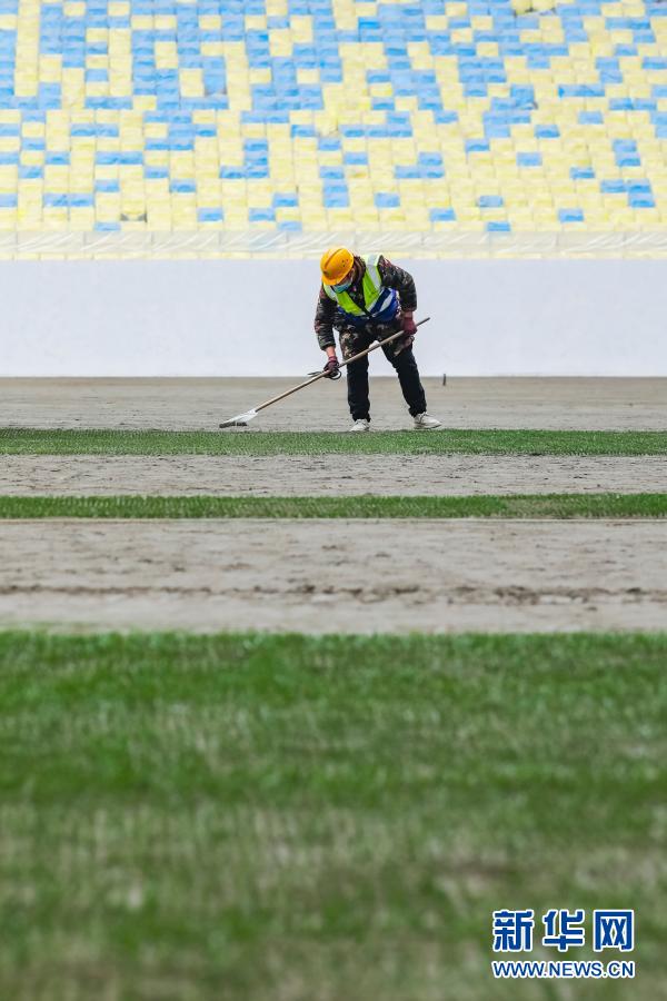 1月27日,工人在成都凤凰山体育公园专业足球场内安装锚固草坪。新华社记者 沈伯韩 摄