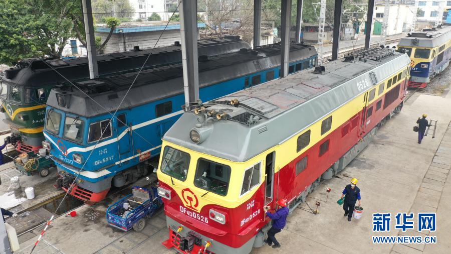 1月29日,在柳州机务段检修车间,卢刚民(右二)提着工具箱和毛线桶走出车间(无人机照片)。