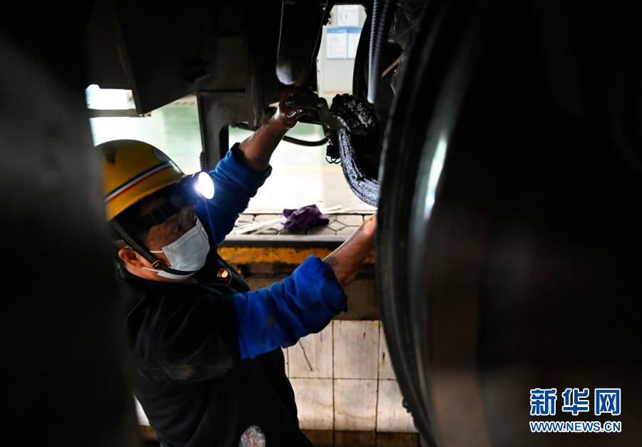 1月29日,在柳州机务段检修车间,卢刚民在更换毛线盒。新华社发(黎寒池 摄)