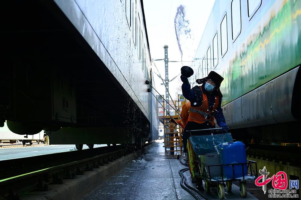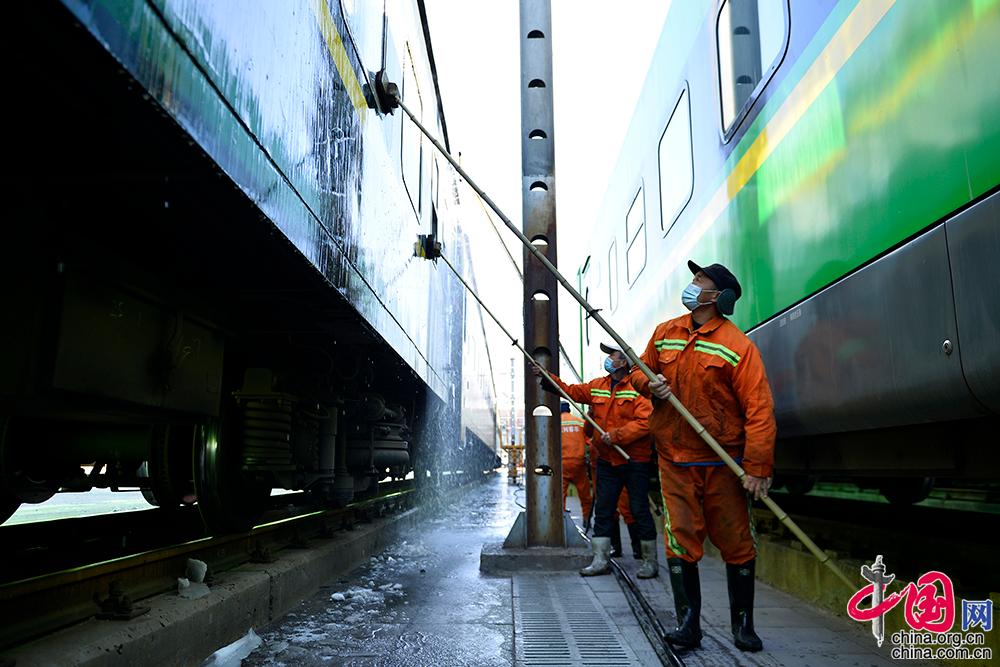 2021年1月29日,北京客运段乘服车间刷车组的“刷车手”正在冲洗列车外皮。摄影:毛卫华