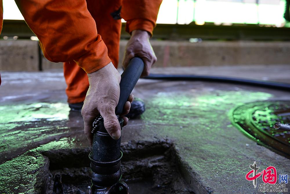 冲刷列车外皮的橡胶管长度约100米,管子不够长的时候,全班组就要回到起点去拖管子,接到下一个整备用水井口的水龙头上,“刷车手”们要反复拖拽冲刷车皮的橡胶管子。