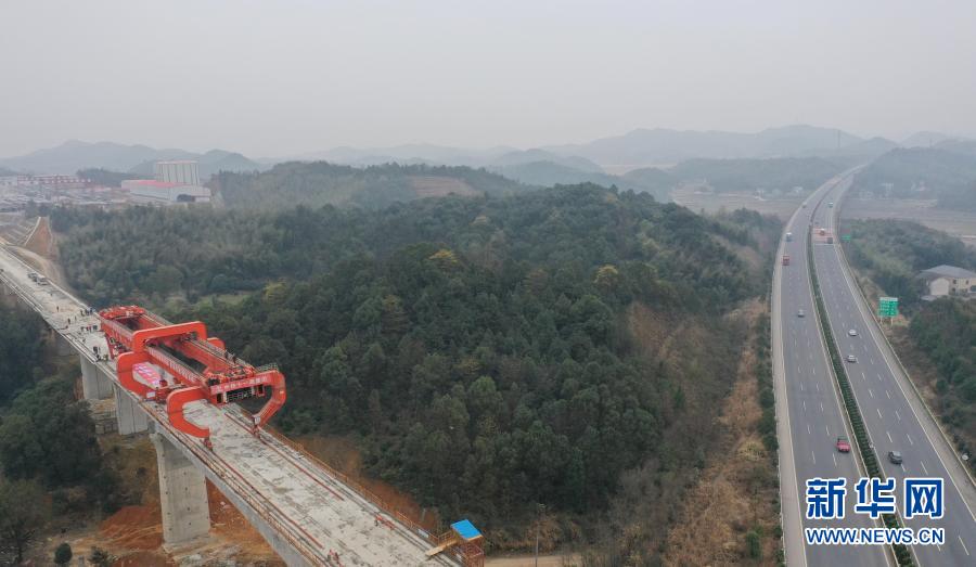 1月31日拍摄的常益长高铁六标箱梁架设现场(无人机照片)。新华社记者 赵众志 摄