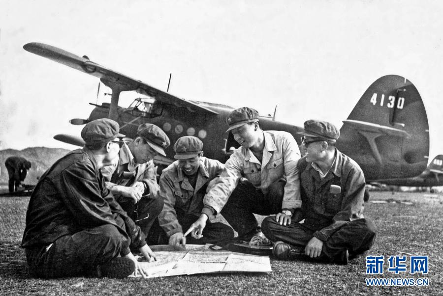 1983年4月,第一代“飞播人”、时任空军某团一大队大队长宋占清(右二)率领一大队多个机组进驻陕西汉中执行飞播造林任务(资料照片)。