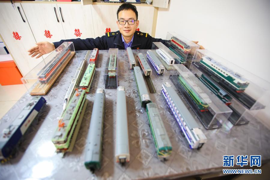 2月2日,张宇琦在家中和自己收藏的火车模型合影。