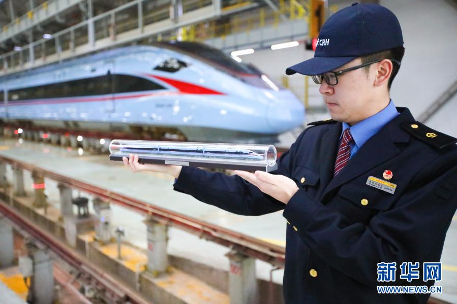 2月2日,在贵阳北动车运用所内,刘宇琦在动车组列车前展示同款动车模型。新华社记者 刘续摄