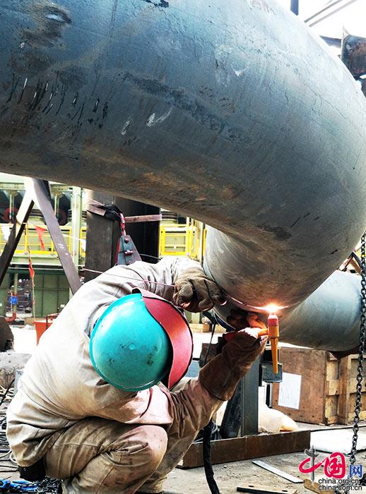 2021年湛江烧结工程进入设备安装高峰阶段,为确保工期,中国二十冶湛江项目部春节期间正常施工作业。图为工人正在进行汽轮发电压力管道焊接。