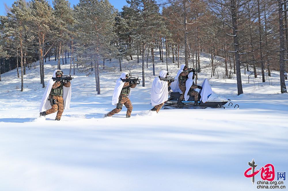 一场山林地反恐特战训练正在如火如荼的展开,据在场的武警黑龙江总队机动支队某特战分队班长武艳强介绍,此项训练主要的目的是抓捕在山林地逃脱的犯罪分子,根据东北的地域特点和气候特点,特战队员借助雪地摩托进行快速机动,就能够迅速有效实施抓捕行动。