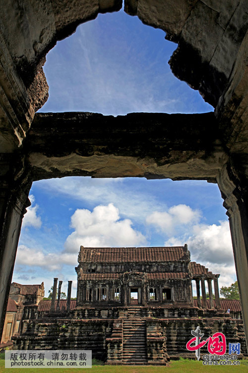 吴哥窟寺坐东朝西。一道由正西往正东的长堤,横穿护城河,直通寺庙围墙西大门。过西大门,又一条较长的道路,穿过翠绿的草地,直达寺庙的西大门。