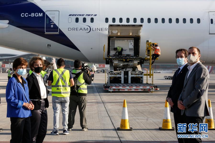 2月26日,在智利圣地亚哥国际机场,智利政府官员迎接中国科兴公司生产的新冠疫苗。新华社发