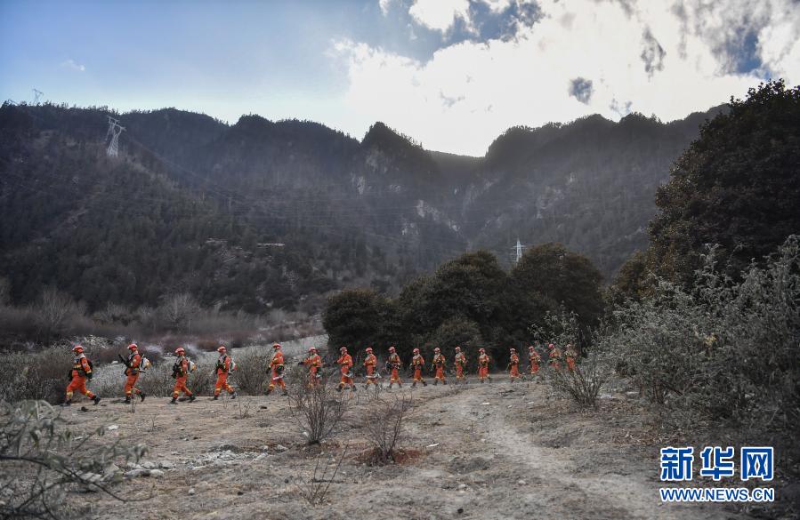 2月26日,西藏林芝市森林消防支队指战员在林区进行消防演练。