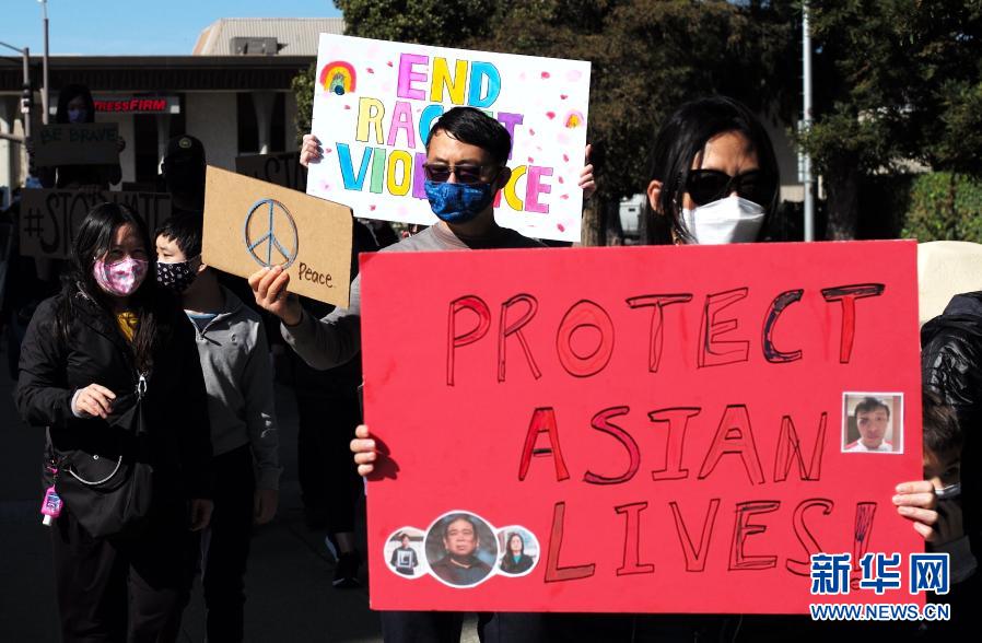 2月27日,在美国加利福尼亚州旧金山湾区圣马特奥市,人们参加集会反对针对亚裔的歧视行为和仇恨犯罪。新华社记者 吴晓凌 摄