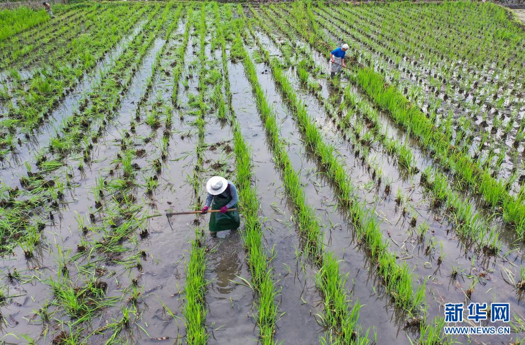 3月27日,茭农在景宁畲族自治县景南乡上标村茭田里疏除茭苗(无人机照片)。