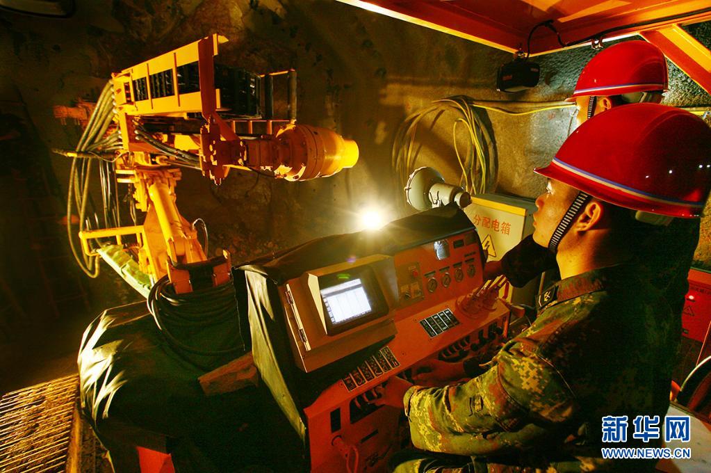火箭军某部官兵在掘进作业中操作全电脑凿岩台车钻孔(2014年4月12日摄)。