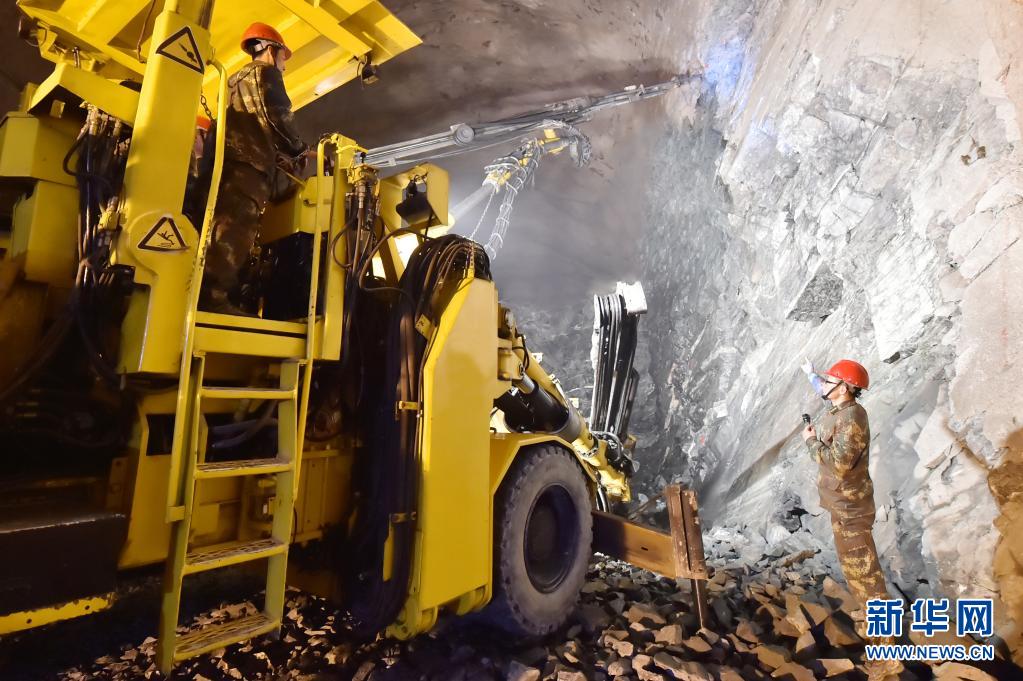 火箭军某部官兵在掘进作业中指挥凿岩台车向岩层深处掘进(2016年4月26日摄)。