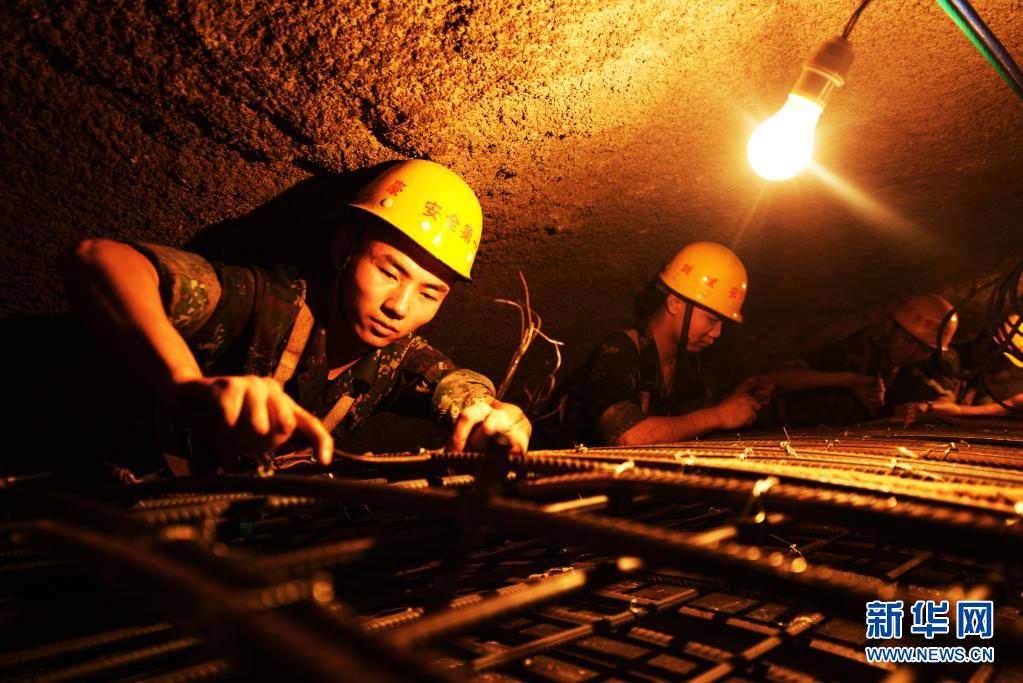 火箭军某部官兵在密闭狭小的作业空间里编钢筋(2015年4月2日摄)。