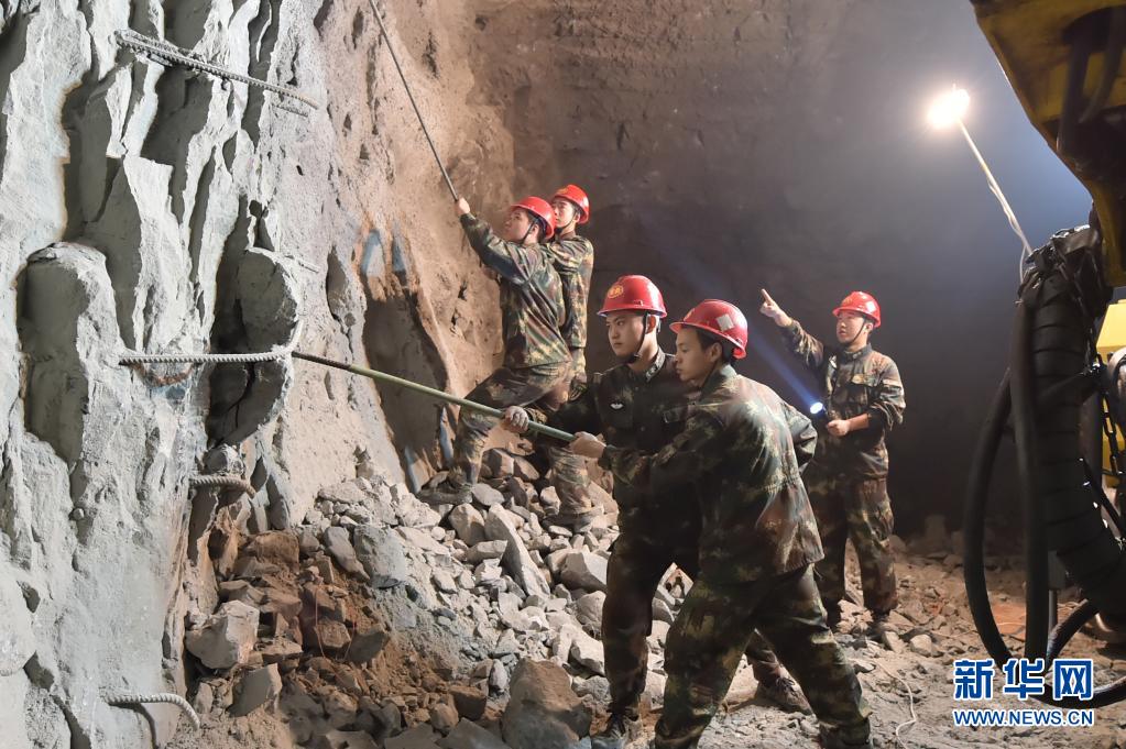 火箭军某部官兵在施工中遭遇不良地质,采取人工紧急排险(2016年10月7日摄)。