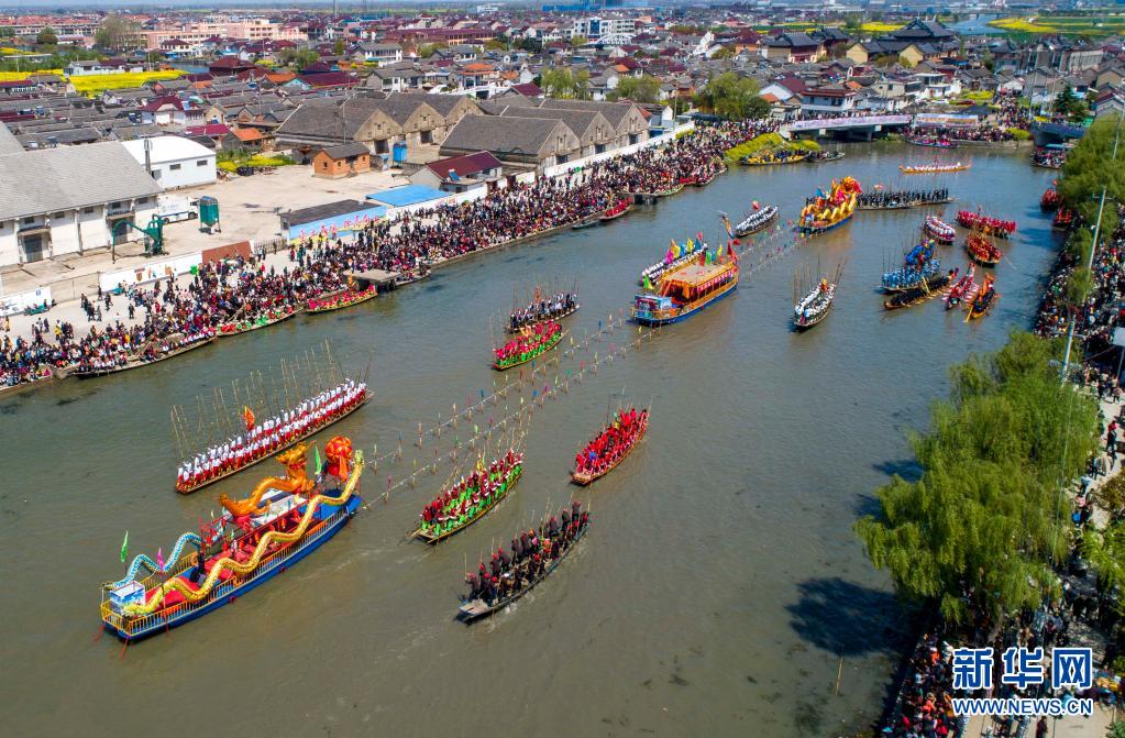 4月4日,船只云集茅山西大河参加茅山会船(无人机照片)。