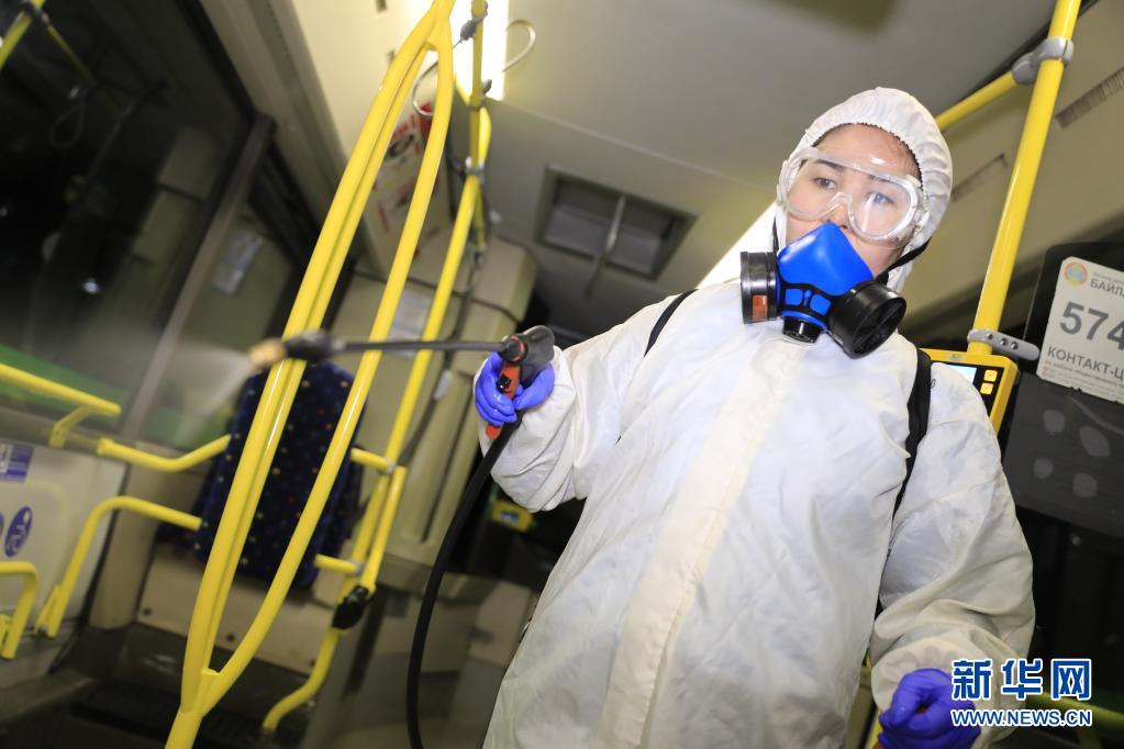 4月7日,工作人员在哈萨克斯坦努尔苏丹对公交车进行消杀作业,以遏制新冠病毒传播。