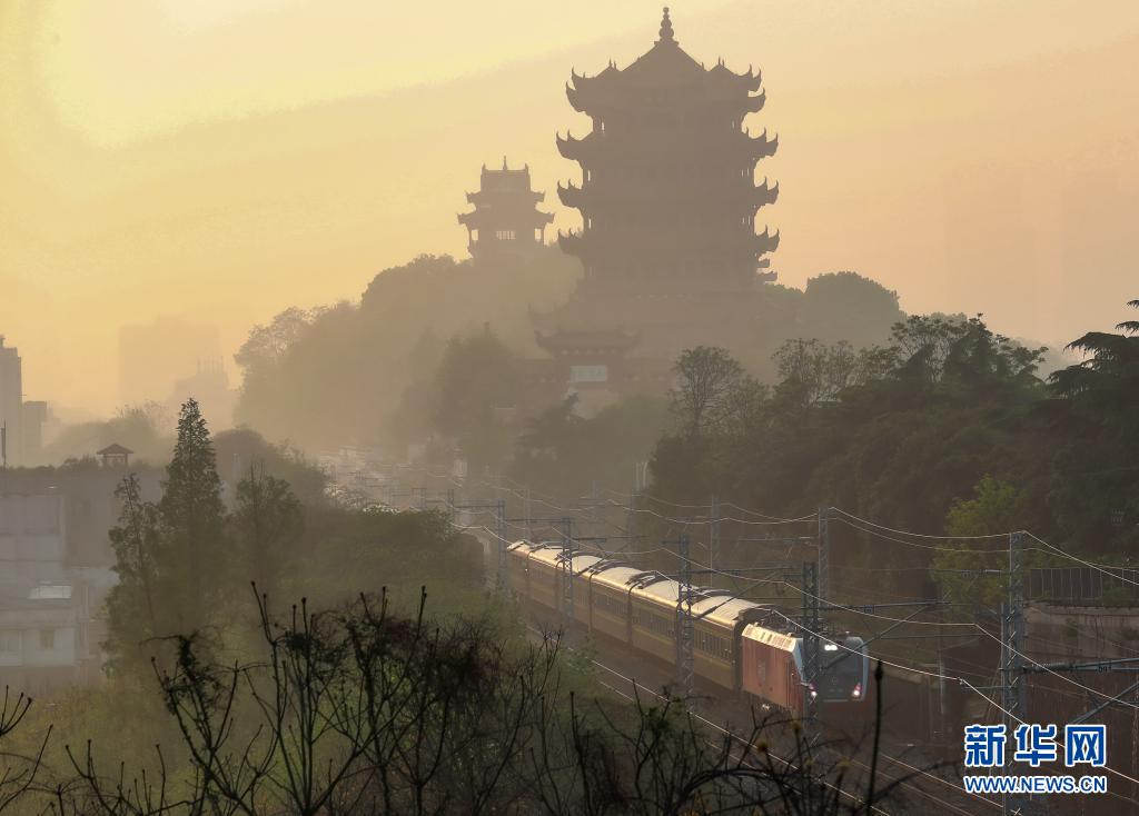 4月9日,一趟列车经过武汉市黄鹤楼公园。