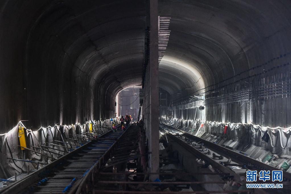 4月10日,施工人员在广州地铁18号线冼村站南端盾构井双轨隧道作业。