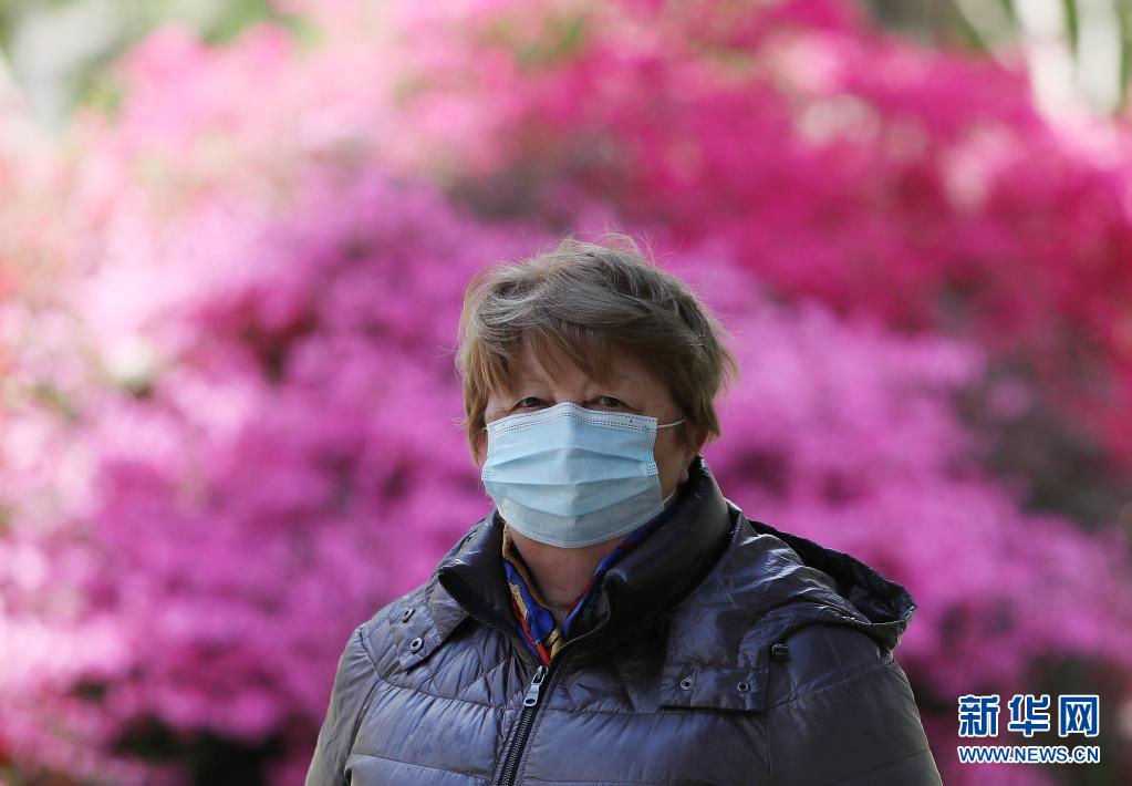 4月15日,一名女子戴口罩走在法国巴黎的一处公园内。