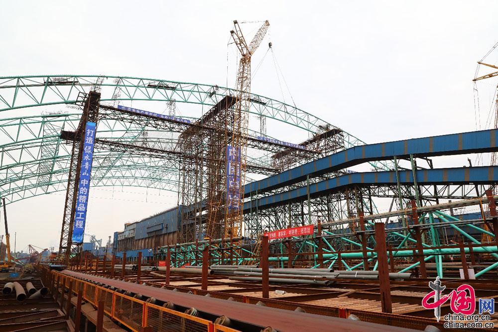 中国网4月16日讯 由中国二十冶承建的全国最大全封闭式料棚——沙钢6号料场棚化项目,是沙钢集团为环境治理,减少无组织排放,将露天原料堆场全面棚化封闭的超大型环境保护工程。场地全长953米、总宽411米,占地面积34.5万平方米,相当于48个标准足球场大,封闭形式采用了三连跨组合而成,建成后将是全国最大的全封闭式料棚。