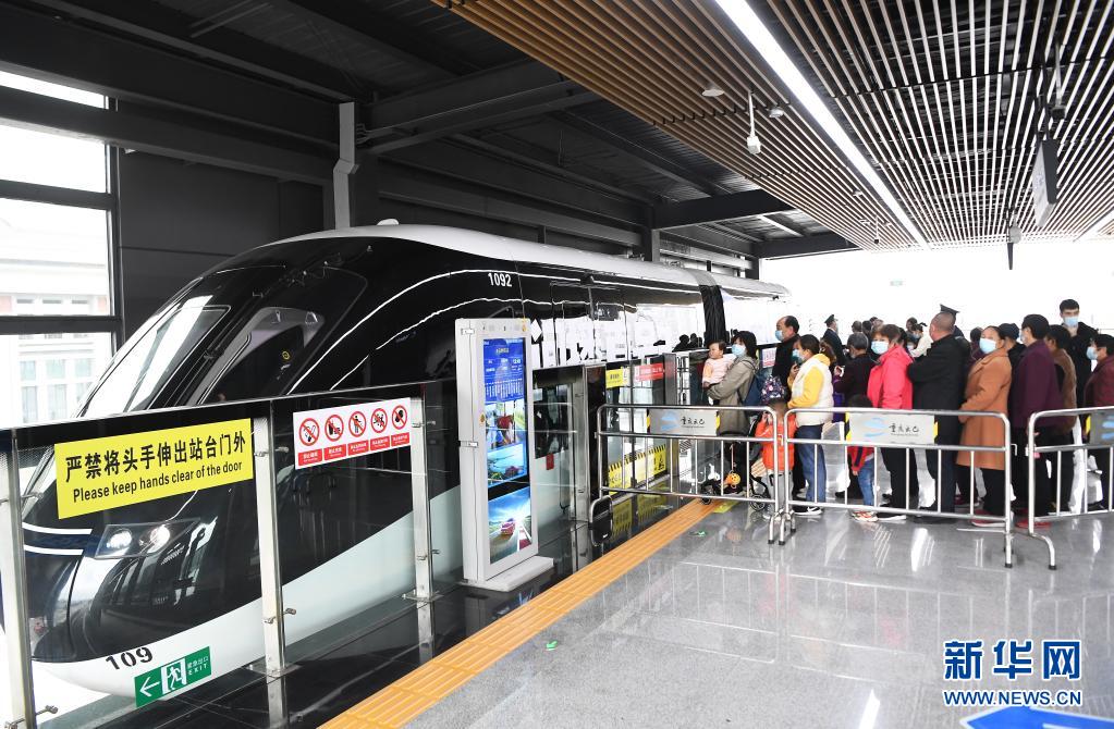 4月16日,乘坐“云巴”的乘客在位于重庆市璧山区的1号地铁站排队上车。