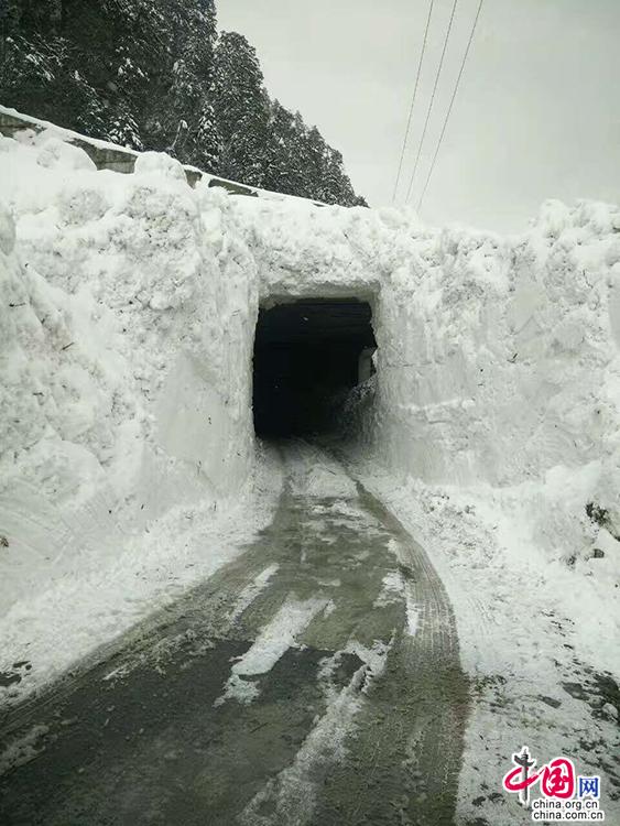 大雪后的山腰上,汽车要通过这样的“雪隧道”才能到达独龙江乡。南方电网 供图