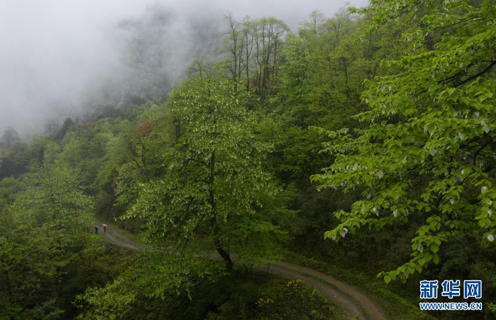 4月18日,在四川省荥经县安靖乡大通桥村,游人在雨中欣赏盛开的鸽子花(无人机照片)。