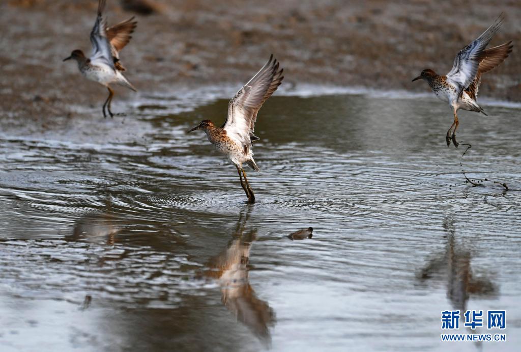 在闽江河口湿地国家级自然保护区,几只尖尾滨鹬在觅食(4月20日摄)。