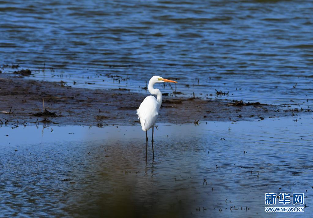 一只白鹭在闽江河口湿地国家级自然保护区觅食(4月20日摄)。