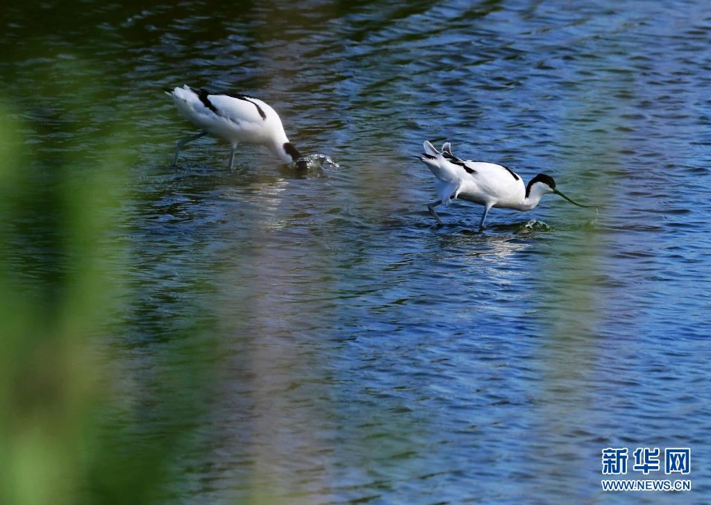 在闽江河口湿地国家级自然保护区,两只反嘴鹬在水中觅食(4月20日摄)。