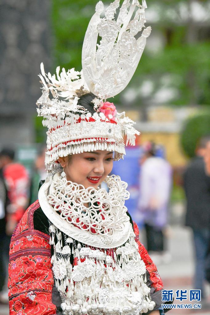 4月25日,一名苗族女孩在参加“2021中国台江苗族姊妹节”盛装巡游。